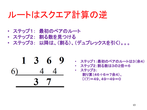 例えば4桁である1369のルートの場合。まず、ステップ1。頭の数のペア「13」のルートを求めて、ここでは「13のルートはだいたい3で、4余る」と考えます。