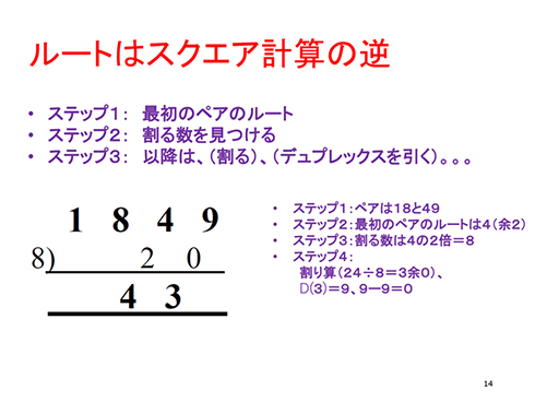 時間が来たので、駆け足で。スクエアの演算を逆にすると、ルートの演算になります。