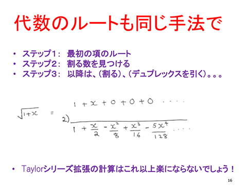 この計算方法はもっと大きな数字の計算にも使えますし、1+xのような代数に用いれば、Taylor series(テイラー級数)の拡張が簡単に求められます。
