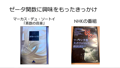 私がゼータ関数に興味を持ったきっかけになったのは「素数の音楽」(著マーカス・デュ・ソートイ/イギリスの数学者)という本と、「リーマン予想 天才たちの150年の闘い」というNHKの番組です。