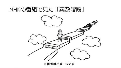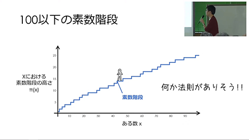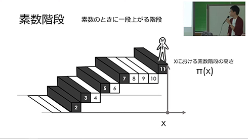 同番組には、ドイツの天才数学者・ガウスが、天に向かって延びる「素数階段」を登っていく謎のCG映像が出てくるんですけど。その階段は素数のところで1段上がり、xまで行ったときにx以下の素数の個数が分かるようになっています。