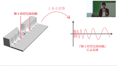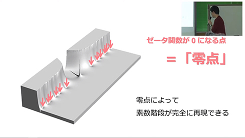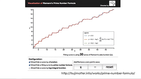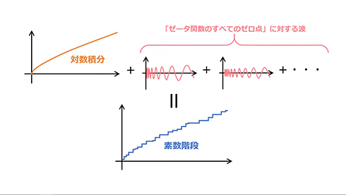 これは一体何なのか。もともと対数積分という素数階段に似た曲線があるんですが、そこに先ほどの“零点の波”を足し合わせると、素数階段が完全に再現できる、というのがスゴいことなんです。