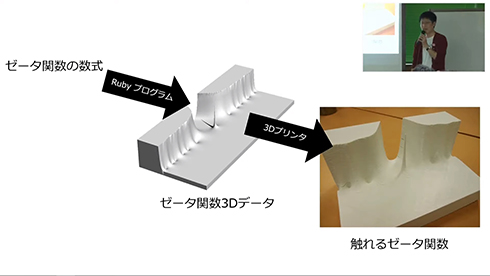 で、「触りたい!」と思って、Rubyのプログラムを使って、ゼータ関数の数式の3Dデータを作りまして、3Dプリンタで「触れるゼータ関数」を作りました。