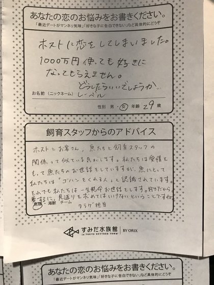 すみだ水族館スタッフによる恋愛相談がユニーク 「ホストに恋して1000万円使いました」→「魚と飼育スタッフの関係に似ている気がします」