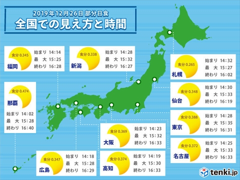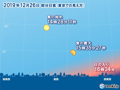 今年2回目の部分日食は、あす26日午後2時過ぎから日没にかけて起こります。東京では食の始めは14時28分11秒。最大になるのは15時35分27秒です。晴れていれば日没前まで観測することができます。ちなみに、シンガポールの近くやグアム島など東南アジアの一部では金環日食を見ることができます。次回、日本で見られるのは2020年6月21日です。