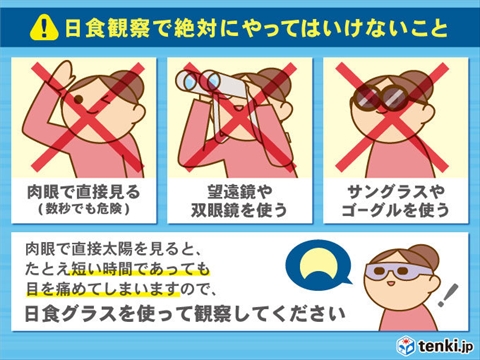 日食を観察する際の注意点です。肉眼で直接太陽を見たり、望遠鏡や双眼鏡、サングラスやゴーグルなどを使うことは絶対にやめましょう。例え短い時間であっても目を傷めてしまいます。観察する際は必ず日食グラスなど専用のものを使って安全に観察を楽しんでください。