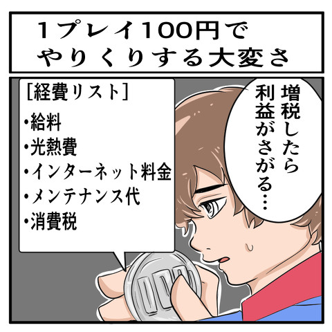 「ワンコイン」という言葉もあるように、アーケードゲームは100円硬貨を用いる筐体が主流で、細かい値上げができません。つまり消費税が8%→10%に増えたからといって、「差額の2円だけ上乗せします」とはできないんです。