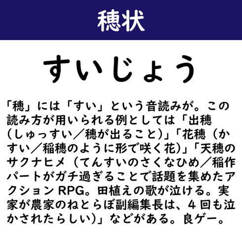 「穂」には「すい」という音読みが。この読み方が用いられる例としては「出穂(しゅっすい/穂が出ること)」「花穂(かすい/稲穂のように形で咲く花)」「天穂のサクナヒメ(てんすいのさくなひめ/稲作パートがガチ過ぎることで話題を集めたアクションRPG。田植えの歌が泣ける。実家が元兼業農家のねとらぼ副編集長は4回も泣かされたらしい)」などがある。良ゲー。