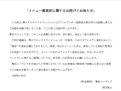 SPA&HOTEL舞浜ユーラシアは、「レストランメニューにアレルゲンの一部表記欠落が有りお客様に多大なご迷惑をお掛け致しました事、ここに深くお詫び申し上げます」と謝罪し、中華丼のアレルゲン表記からエビが漏れていたことを認めました。