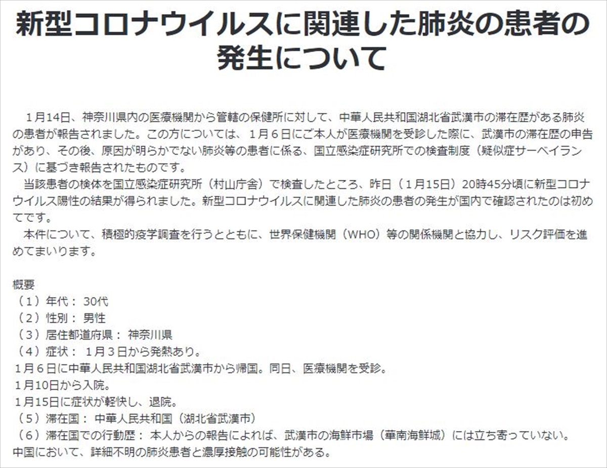 また患者本人は症状が軽快して1月15日に退院しているといい、本人からは「武漢市の海鮮市場(華南海鮮城)には立ち寄っていない」といった話が聞かれているそうですが、厚労省の発表では「中国において、詳細不明の肺炎患者と濃厚接触の可能性がある」とされています。