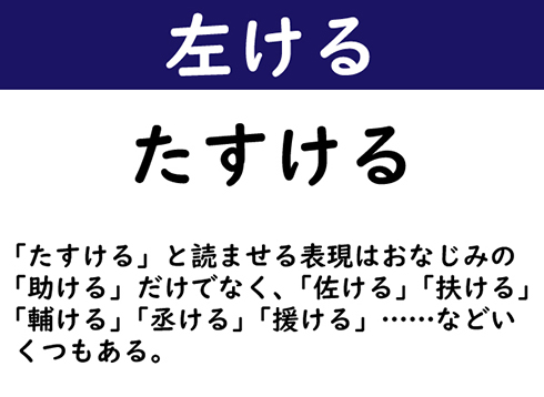 「たすける」と読ませる表現はおなじみの「助ける」だけでなく、「佐ける」「扶ける」「輔ける」「丞ける」「援ける」……などいくつもある。