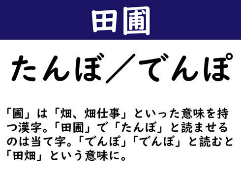 「圃」は「畑、畑仕事」といった意味を持つ漢字。「田圃」で「たんぼ」と読ませるのは当て字。「でんぽ/でんぼ」と読むと「田畑」という意味に。