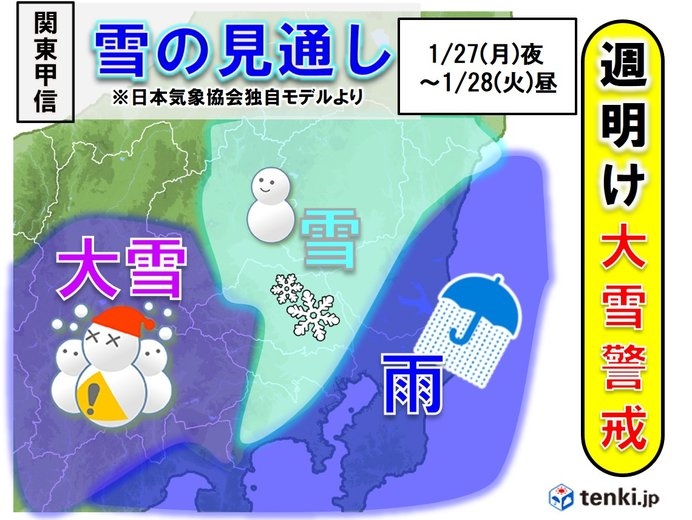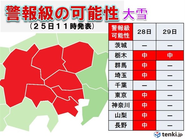 水戸、銚子を除く関東甲信の各気象台は大雪に関する早期注意情報を発表しています。警報級の可能性があるのは、28日(火)は栃木、群馬、埼玉、東京、神奈川、山梨、長野。29日(水)は栃木です。