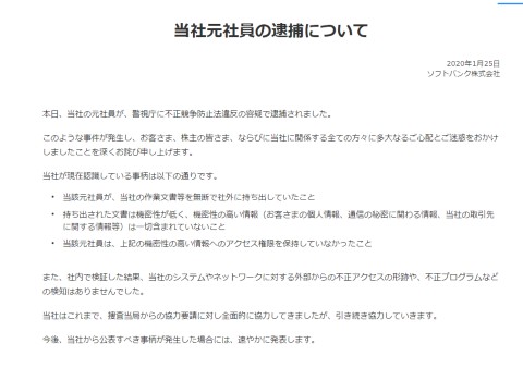 ソフトバンクは1月25日、同社の元社員が警視庁に不正競争防止法違反の容疑で逮捕されたとしてコメントを発表しました。