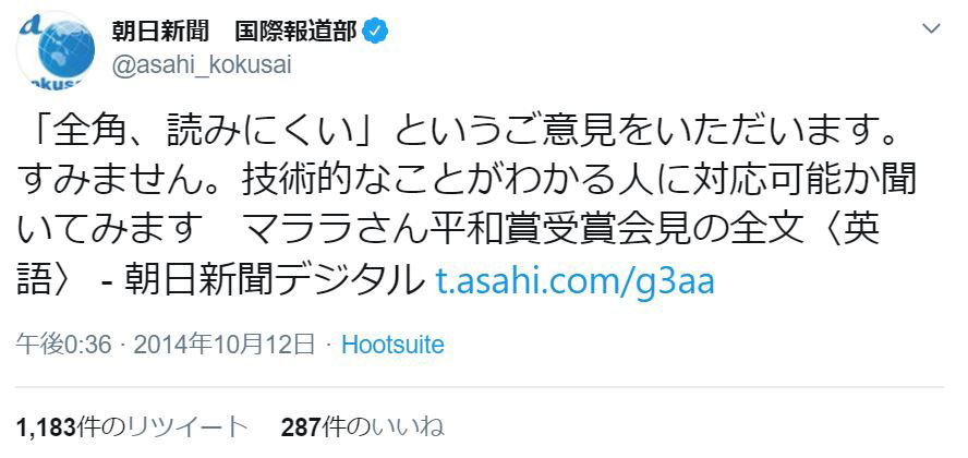 長きにわたり全角英数字表記を貫いてきた朝日新聞デジタル。日時をはじめ、URLなども全角で記載していたことから、URLをコピー&ペーストしにくいといった不満の声や単純に読みづらいという声が定期的に上がっており、2014年10月12日には朝日新聞 国際報道部が公式Twitterにて「『全角、読みにくい』というご意見をいただいます。すみません。技術的なことがわかる人に対応可能か聞いてみます」とツイートすることもありました。