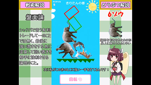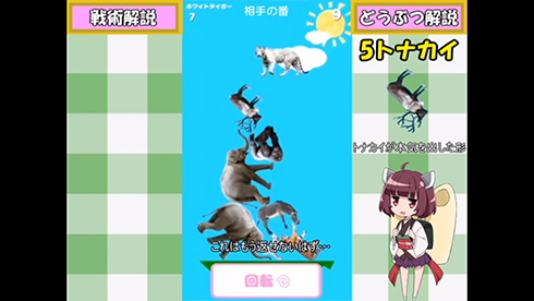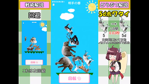 DTBでは「回転」ボタンを押すと動物が45度ずつ回り、動物を落下させる角度が変えられるのですが、その回転途中で動物を落下させると、より細かな角度変更ができます。これが「ディレイ」というテクニック。動画内の対戦では、相手が「ホワイトタイガーをディレイさせて0.03秒だけ回し、不安定な斜面にピタリと着地させる」ことに成功し、ゲームは終わらず。