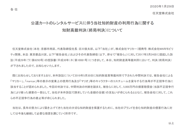 任天堂が公道カートレンタル事業者のMARIモビリティ開発(旧社名「株式会社マリカー」)に対し著作権侵害などを訴えていた件で、知財高裁は1月29日、MARIモビリティ開発側に5000万円の損害賠償金支払いを命じました。