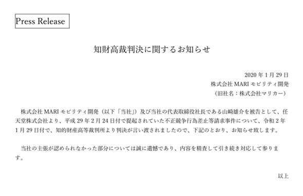 知財高裁判決を受けて、MARIモビリティ開発は「当社の主張が認められなかった部分については誠に遺憾であり、内容を精査して引き続き対応して参ります。」とコメントしています。