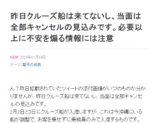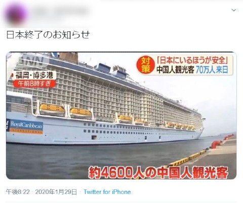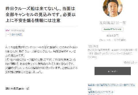 中国からのクルーズ船が福岡・博多港に寄港したとする画像に「福岡終了のお知らせ」「日本終了のお知らせ」などの文言を添えたツイートが1月29日に拡散したことを受け、高島宗一郎市長は、同日はクルーズ船は来ていないとコメントし、「必要以上に不安を煽る情報に注意しましょう」と呼びかけました。