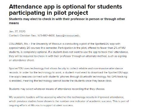 米ミズーリ大学が、「アプリを使って学生の出欠を監視している」との報道を受け、「アプリの利用は任意」だとするコメントを発表しました。