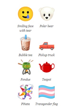 ホッキョクグマ、タピオカミルクティー、フォンデュなど62種が決定。新しい絵文字は通常、9月〜10月に携帯電話で使用できるようになるとのこと。