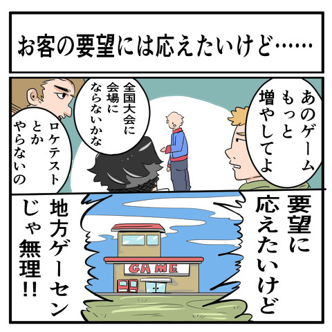 後は、トラブルというわけではないのですが、大会運営は大変だった覚えがあります。公式大会の予選会場になったりすると、普段はうちの店で遊んでいないお客さまもプレイすることになるので、例えば「いつもと筐体が違う!(※)」といった事態が起こります。