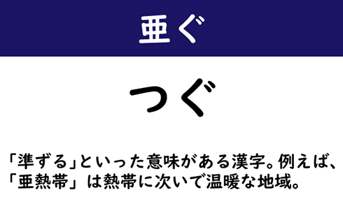 「準ずる」といった意味がある漢字。例えば、「亜熱帯」は熱帯に次いで温暖な地域。