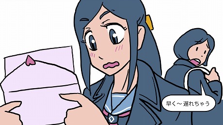 朝、学校に登校してきたポニーテールの女の子。彼女が自分の靴箱を開けると「伝えたいことがあるので、今日の放課後、体育館裏に来てください」と書かれた手紙が入っていました。これは青春の予感……!