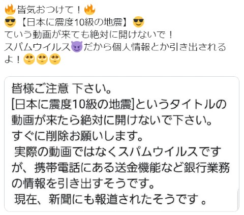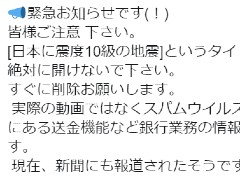 メッセージは2月5日夕方ごろから広まっており、内容は「日本に震度10級の地震」というタイトルの動画が送られてきたら開かないようにと注意を促すもの。「実際の動画ではなくスパムウイルスですが、携帯電話にある送金機能など、銀行業務の情報を引き出すそうです。現在、新聞にも報道されたそうです」と書かれています。