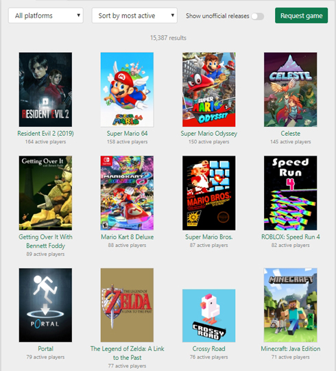 世界的に人気のタイトルなら「Speedrun.com」を見れば……「most active」でタイトルをソートすると「マリオ」が2番、3番。やっぱり人気ですね。