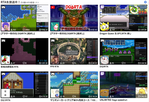 「RTA in Japan」のスタッフが「RTA生放送中!」というWebサイトを作っていて、そこを見れば国内のRTA生配信をリアルタイムで一覧できます。国内だと「ドラクエ」が人気ですね。