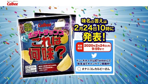 また「何味?」の味名を当てるキャンペーンも実施中。Twitterで「#ナニコレカルビーさん」を付けて予想の味名を投稿すると、正解者などから抽選で10人に「何味?」1ケース(12袋)が当たります。締切は2月24日9時59分で、正解は同日10時に発表となります。