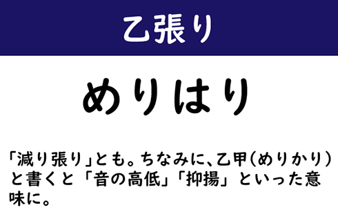 「減り張り」とも。ちなみに、乙甲(めりかり)と書くと「音の高低」「抑揚」といった意味に。