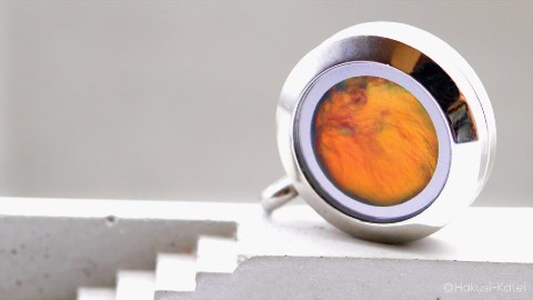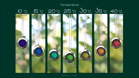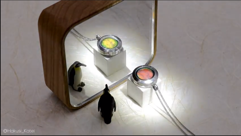 理系なものを作っている工学博士のものり(@Hakusi_Katei)さんが、材料科学分野の工学博士のHamolaty(@hamolaty)さんと共同開発した「液晶ウィンドウ」ネックレスという作品で、ネックレスに小さな丸いケージがついています。ケージを鏡の前に置いて光を当てると、ケージの中が鏡の向こうは黄色、鏡の手前はオレンジ色に。同じものなのに色が違う! さらに光を当てる場所を変えると、鏡の向こうがオレンジ色、手前が黄色と逆になります。温度によっても色が大きく変わるとのこと。