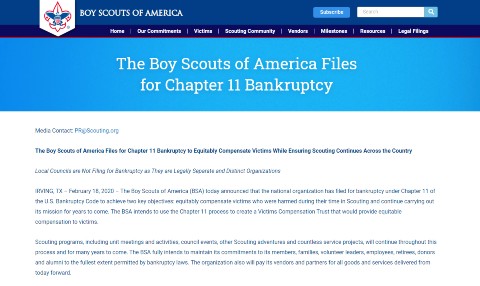 米国のボーイスカウトアメリカ連盟(BSA)が2月18日(現地時間)、米破産法11条(日本の民事再生法に当たる)の適用を申請したことを発表しました。同連盟は性的虐待の被害者からの訴訟を抱えており、破産申請の理由は被害者への補償のためと今後のミッション遂行のためとしています。