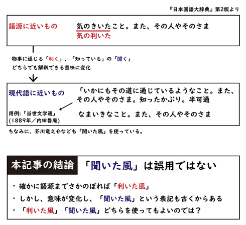 「聞いた風」の表記が誤用だとする説は、「きいたふう」というときの「きく」は、耳できく「聞く」ではなく、気がきいているという意味の「利く」だから、「聞く」はおかしいのだと主張しています。これを受け入れるなら、内田魯庵も芥川竜之介も漢字を誤用しているということになります。