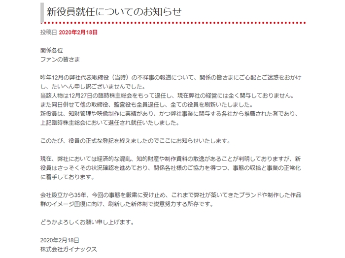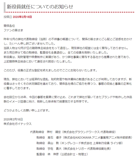 アニメーション制作会社のガイナックスは2月18日、2019年12月に発覚した前代表取締役逮捕の不祥事を受けて、当該人物を含む役員の刷新を行ったと公式サイトで発表しました。