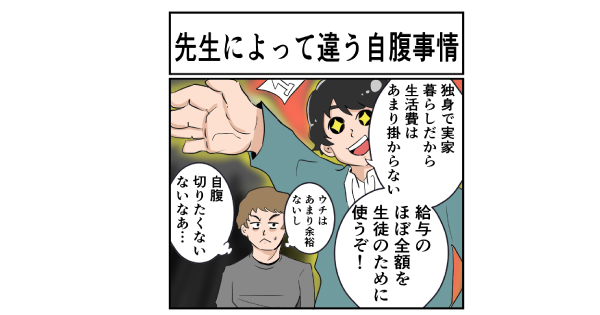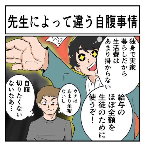 自腹というのは自分のお金を使うものだから、切るも切らないも教員の自由。「生徒のためならいくらでも」という先生もいれば、渋る先生もいる。