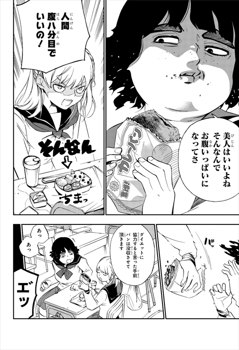 小さいころから仲の良かった富子と乙女。子どものころ、先に美容に目覚めて乙女にオシャレを教えていた富子ですが、今では追い抜かれてやる気も自信もなくし「乙女の引き立て役」のように感じています。食べ過ぎで16キロ体重が増え、容姿にも自信を持てない富子に、乙女は「とみちゃんの事ブスだと思った事ないよ」と努力すればきれいになると言うのですが、富子はその言葉を真っ直ぐに受け取れず、「いいよね、元が美人は努力しなくても美人だからさぁ!!」と拒絶します。