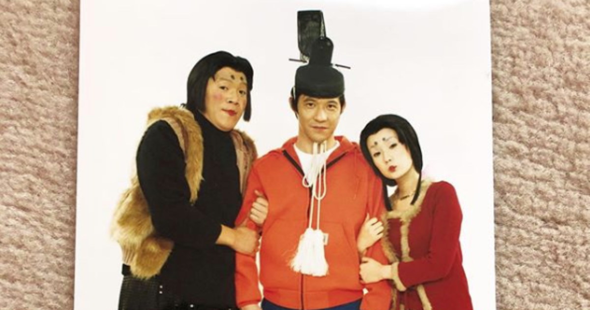 写真の中の3人は普通の服装ながら、髪形や化粧、帽子などが平安時代感あふれるものとなっています。ウドさんは女装をしており、内村さんがウドさんと千秋さんに腕組をする構成。コメント欄によると、「ゲンジ物語」というコントの写真のようです。