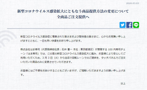 回転寿司チェーンの「はま寿司」は、新型コロナウイルスの感染拡大に伴い、3月3日より全店で回転レーンでの提供を停止すると発表しました。期間中はタッチパネルで注文した商品のみ提供されます。
