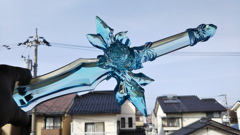 青空に向けて剣を掲げた写真では、クリアな美しさが一層際立ちます。氷属性っぽい……!