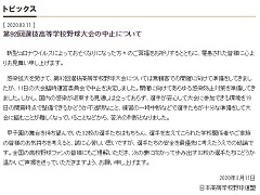 日本高等学校野球連盟が、新型コロナウイルス対策として3月19日から開催予定だった第92回選抜高等学校野球大会を中止すると発表しました。