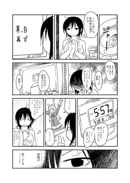 ところが、再びトイレに立った女性を同じ悲劇が襲います。「もおおおお時間ないのに」と嘆きながら時計を確認すると、あれ、思ったよりも経過してない? それどころか時間が戻ってる……?
