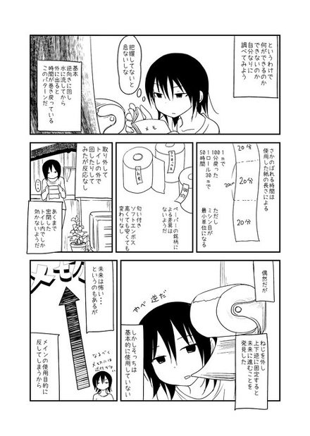 タイムトラベルに気付いた女性は検証を開始。トイレの中でさまざまな行動を取り、時間が戻っているか試します。原因を絞り込んだ結果、どうやら秘密は最近買ったトイレットペーパーホルダーにあるもよう。トイレットペーパーを逆に装着することで、時間をさかのぼる力が発動するようです。