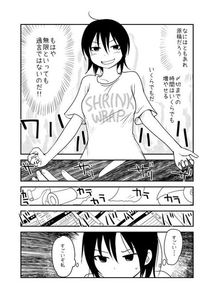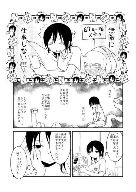 タイムマシンを使い、締め切りまでの時間を何度もループし続ける女性。これなら膨大な時間をかけて考え抜いた名作が誕生する……と思いきや、性格が反映された怠惰な生活がだらだらと続くのみ。「すごい…すごいぞ私 無限に仕事しない!!!」