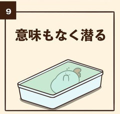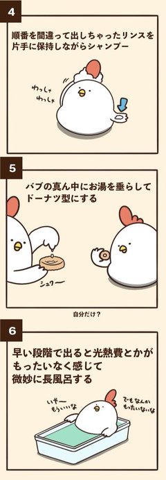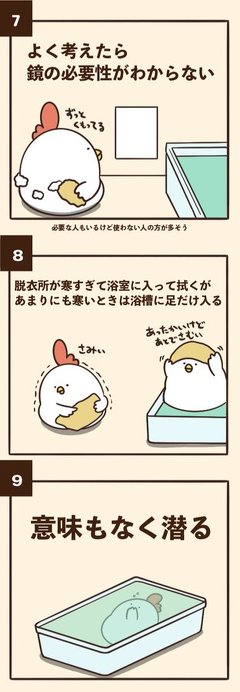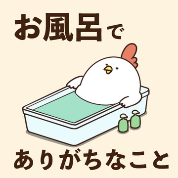 続いて2本目は「おふろでありがちなこと」。「脱衣所が寒すぎて浴槽に足だけ入った状態で体を拭く」「意味もなく潜る」など、思わずフフッとなる“あるある”が並んでいます。とさかをシャンプーする“でぶどり”の絵面もシュール。