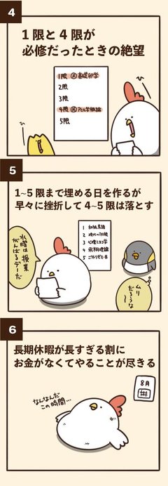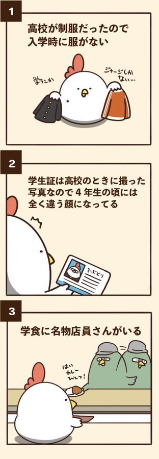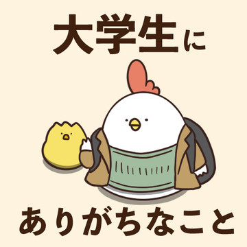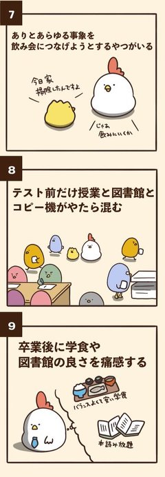 「高校が制服だったので入学時に服がない」「1〜5限まで埋める日を作るが、早々に挫折して4〜5限は落とす」といった入学したてにありがちな絶望から、「学生証の写真が4年生のころには全く違う顔になっている」「卒業後に学食や図書館の良さを痛感する」といった哀愁漂うネタまで、9つの“あるある”をイラスト化しています。