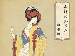 「浮世絵プリンセス」の第1弾は、黄色い着物と赤のリボンが印象的な「白雪姫」。着物の袖に隠れた手でりんごを持つ姿にうっとりとしてしまう1枚です。白雪姫のもともとの特徴である黒髪も美しい……!