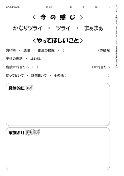 メモの上部では「かなりツライ」「ツライ」「まぁまぁ」の3段階に丸をつけることで、自分の今の状態をおおまかに示せるようになっています。これだけでも参考になって、両親は「今、『かなりツライ』ならそっとしておこうか」という風に介入の仕方を変えていた、と聞いています。